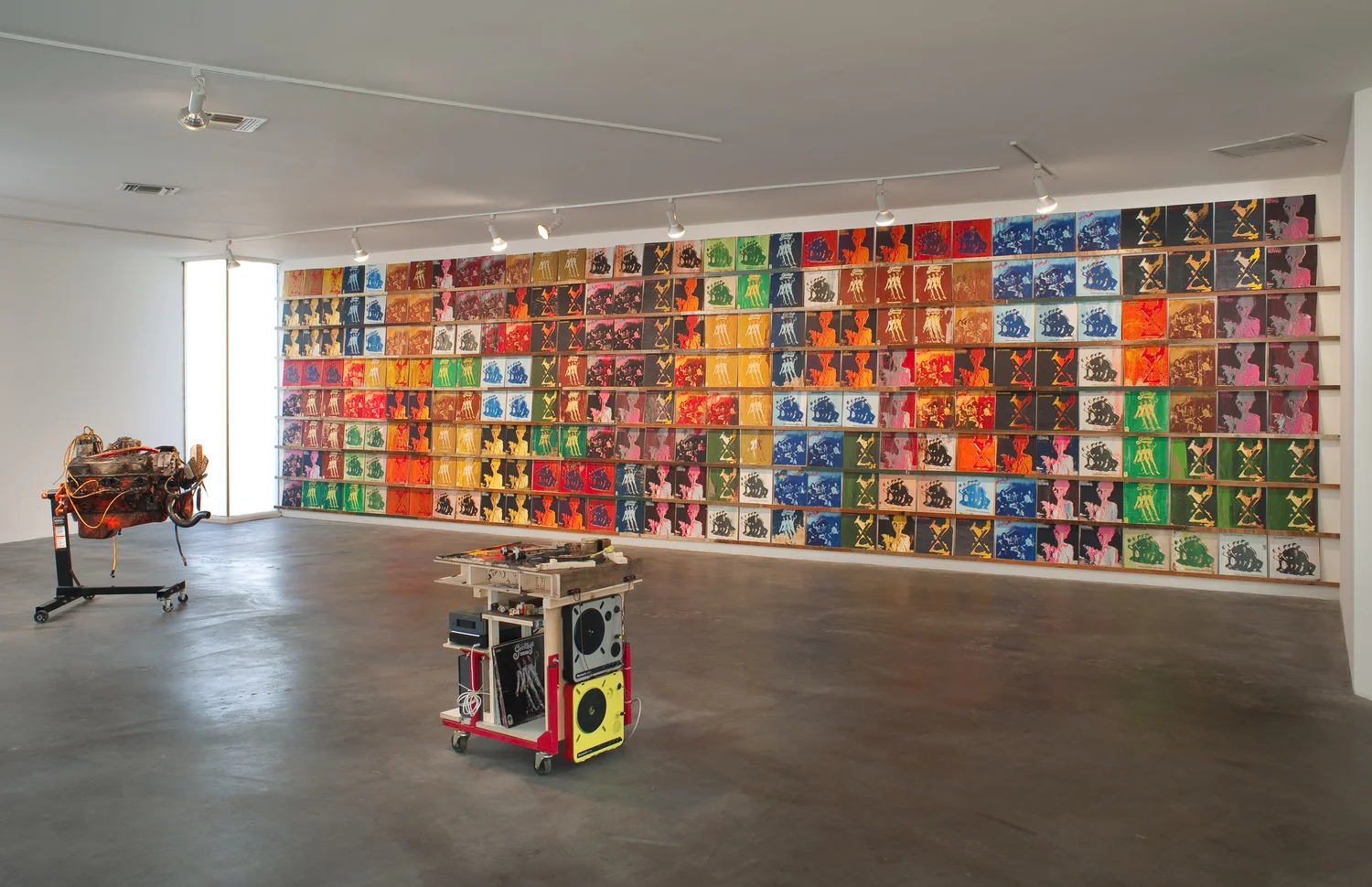 installation view with - Los Angeles - 2009 - Acrylic on scrap wood - 104” x 401” x 2” (256 records, 12” x 12” each on 8 shelves)