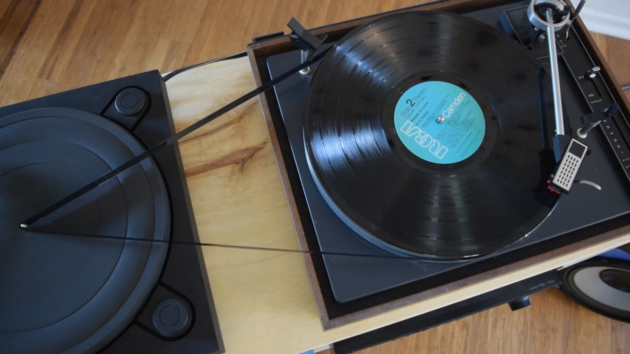 In a crucial twist, two of the three turntable units used to create Duffy’s hybrid turntable were manufactured, but the third was fabricated from wood by the artist. “I tend to do almost all the work for any given show and have only used fabricators a couple of times… I feel it’s very important for me conceptually to physically work on the projects.” By hand copying the third turntable, Duffy became intimately familiar with the mechanics of turntables, thereby injecting a sense of the authentic (the handmade) into this instrument designed to emphasize detachment, or removal, from authenticity.